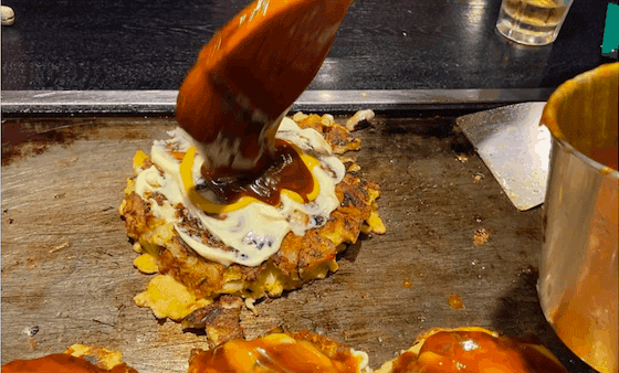 We got one special Ajinoya’s Mix for 1250¥ made of Squid, Octopus, Shrimp, and Minced meat. As well as the variation of 3 Mini, where you can choose 3 Toppings, one for each, and perfect for sharing. We order one cheese, one bacon and one pork for 900¥. And let us tell you, this is great value! You will be rolling out of this place. They cooked the Okonomiyaki at our table in front of us, but you can do it yourself if you wish. We do love the show though….