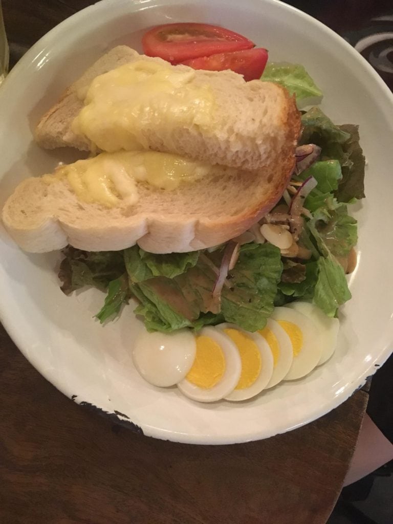 We got the soup and salad plate, that came with a huge slice of cheesy toast and the curry, delicious, but not spicy. Generally, we think the spicier the better, but although this was very mild, the flavor was great and the homemade pickles added to it nicely.